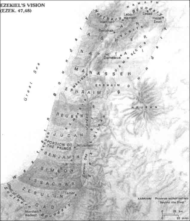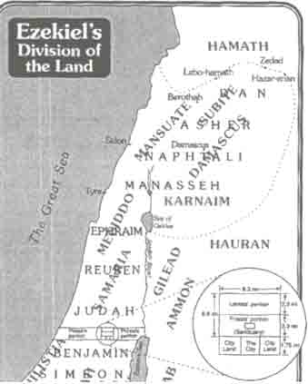 | FORDELING AF LANDET TIL ISRAELS STAMMER UNDER MESSIAS´ KOMMENDE REGERING. De skal bygge huse og bebo dem, plante vingårde og nyde frugten af dem. De skal ikke arbejde forgæves eller føde børn til en tidlig død. Før de kalder på Herren vil han svare dem. (Es. 15:18-25.) Mange tror, at som tabernaklet og templet viste fremad til korset, vil det kommende tempel vise tilbage på Jesu forsoningsdød. HSS | |