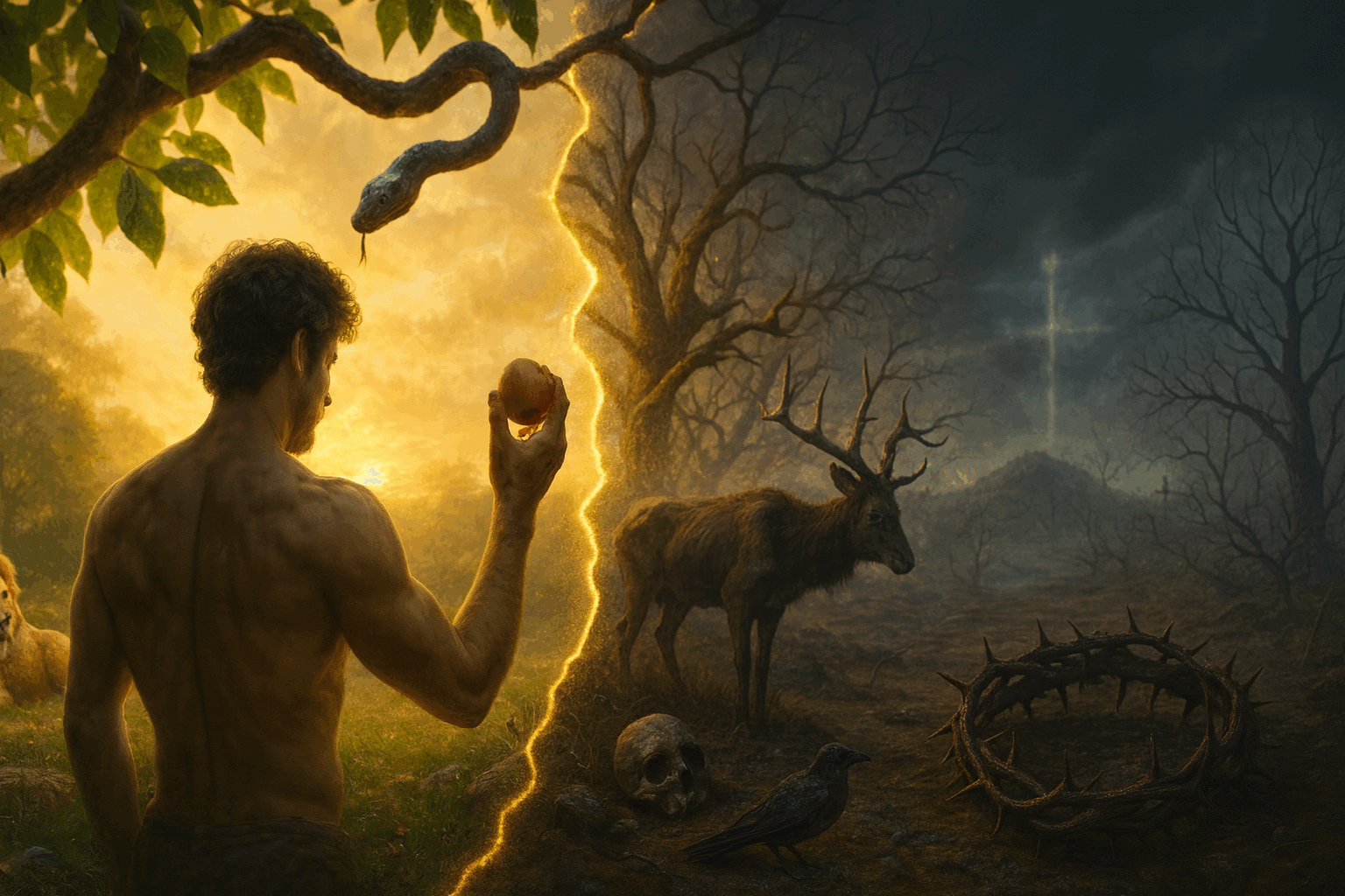 Først da mennesket syndede, frembar Jorden torn og tidsel (1. Mos. 3:18), som er et billede på synden, og dermed lidelse. Mens Jesus led straffen for os, bar Han kronen af torne på sit hoved (Matt. 27:29) og ved det ser vi at Han bar vores synd (se også ”Ben, kød og blod”). Her, lige efter syndefaldet, begyndte historien om forløsningen, der, uanset om vi forstår / accepterer det eller ikke, kræver retfærdighed. Alvoren i at Adam valgte døden med sin Eva, er dyb, og indtil Jesus kom og tog del i døden for at overvinde den, blev dyrene de ofre der dækkede synden – vist ved at Gud selv slagtede de første dyr og dækkede Adam og Evas nøgenhed (1. Mos. 3:21), som blodet dækkede syndens skam – hvilket resten af Bibelens historie mod den endegyldige forløsning fortæller.