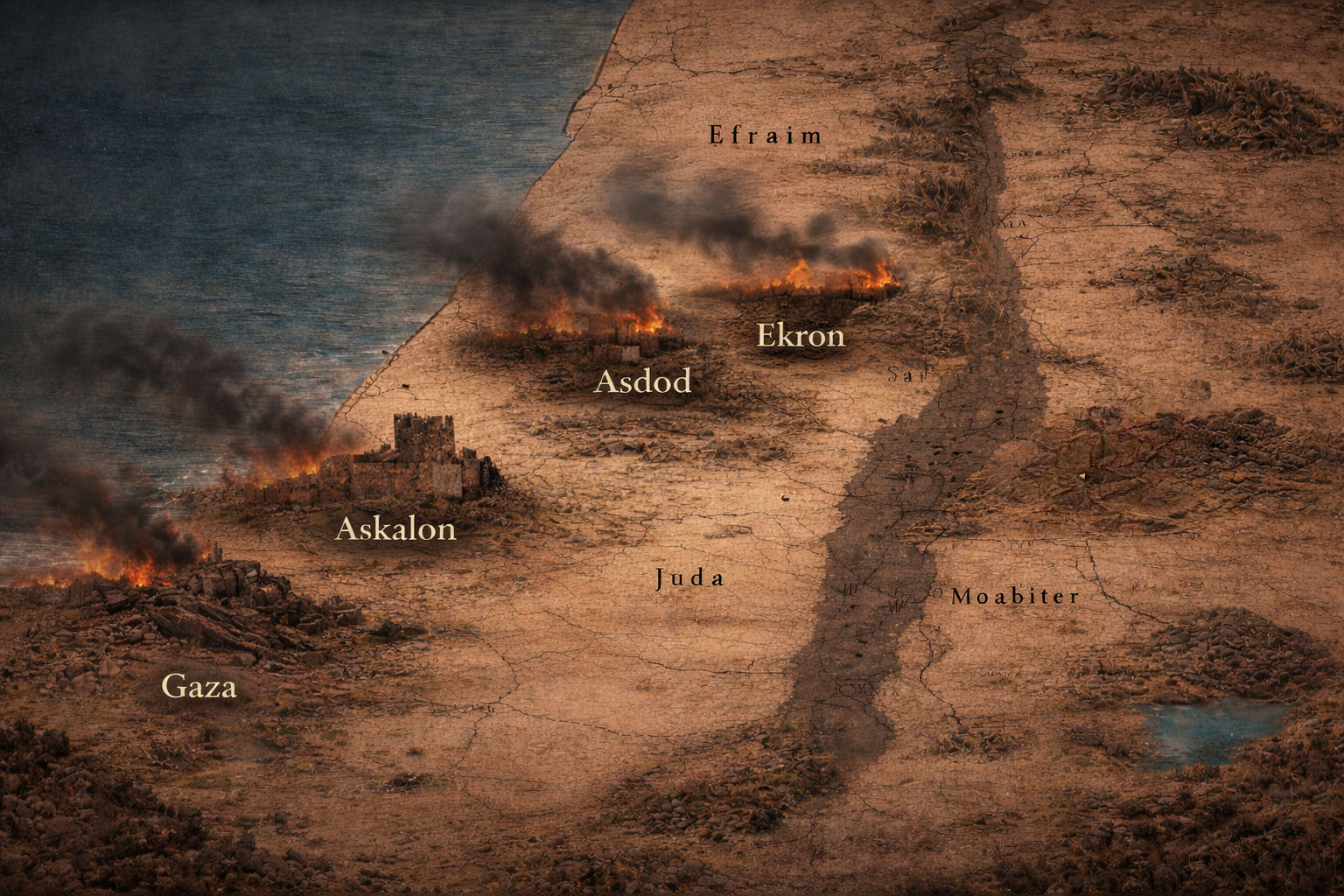 Zef. 2:3 er selve "hængslet". Passagen siger, at det "måske" kan ske, at de ydmyge bliver skjult "på HERRENS Vredes Dag". Det er afgørende for timingen - skjulestedet sættes ikke "dagen før", men på tiden for vredens dag.Og så kommer næste vers (4), med et lille ord "Thi" eller "For": “Thi Gaza skal ligge forladt og Askalon øde, Asdod drives bort ved Middag, Ekron udryddes”. Det betyder, at profeten ikke skifter emne. Han forklarer, hvad denne domsstrøm indebærer: Gaza, Askalon, Ashdod og Ekron nævnes samlet - ikke som fire tilfældige stednavne, men som en kæde af konsekvenser, hvor ordene er hårde: "forladt", "øde", "drives bort ved Middag", "udryddes".