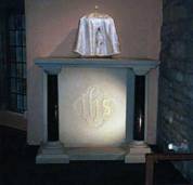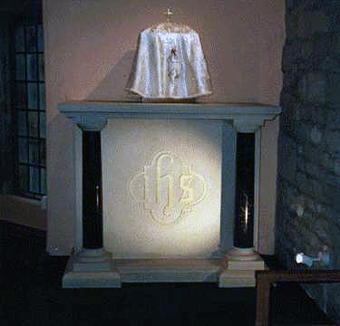 | Et sidekapel i en katolsk kirke i nærheden af Bath, England. Læg mærke til skriften IHS. (Klik for at forstørre) |