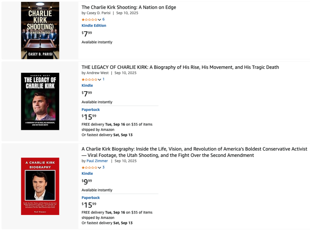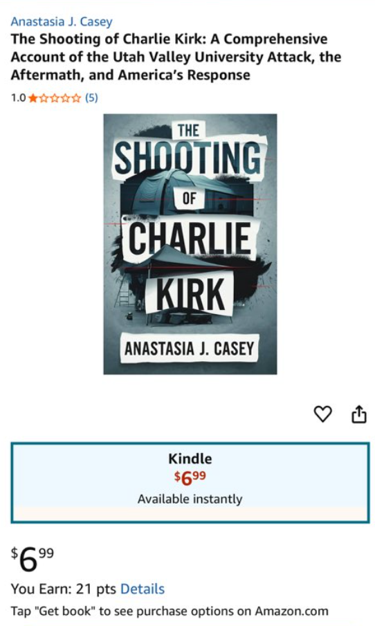 En fjerde bog med titlen ”Skuddrabet på Charlie Kirk”, har skabt meget oprør, da dens udgivelsesdato var dagen før han blev snigmyrdet. Det var ifølge Amazon en teknisk fejl[3].